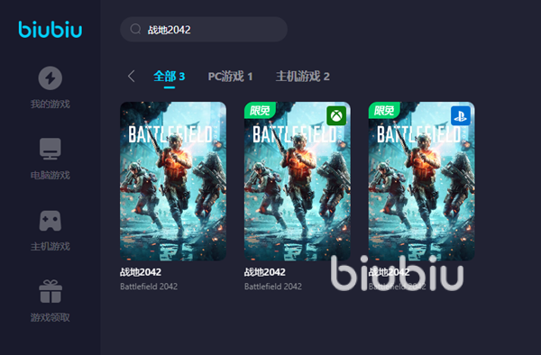 除了PC版之外,战地2042还在Xbox以及PS两大主机平台上推出了,而且还支持了跨平台的联机支持。很多小伙伴的电脑配置不是那么高,所以选择了在主机上购买游玩。选择biubiu的一大理由就是对主机版也提供了加速,而且目前开展了长期的限免活动,不需要大家充值会员就可以畅享。在biubiu中搜索游戏名称就可以看到目前开放的平台和版本支持了,PC玩家直接点击PC版进行加速。