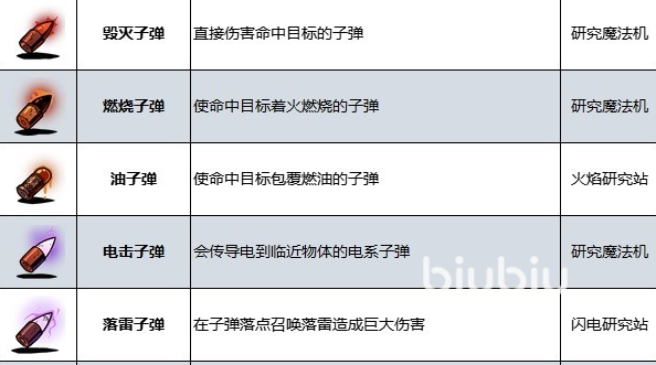 整个武器库当中是有多种不同效果的子弹供大家使用的,只要按照正确的方式研究魔法机就可以依次获得。而这些道具从用处来看,效果分类还是比较明显的。由于游戏当中有不同的职业,子弹也是根据这个来划分不同的魔法流派,并且相搭配的元素伤害,一个做辅助一个做主子弹可以带来更高的效果。