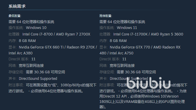 它的具体配置如下图所示,单从显卡来看的话它属于低配置的游戏,10系都不需要。但是推荐配置的要求还是有点高的,需要CPU达到所需的11代I7 11700K。简单来说现在的主流电脑玩起来应该是没有任何压力,都可以流畅运行此款游戏。