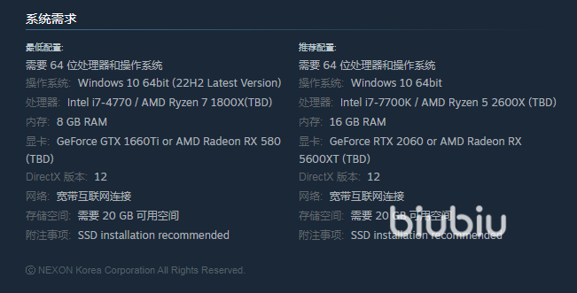 它的具体配置如下图所示,我们一般首要关注的是CPU和显卡,如果这两个硬件能满足的话,那基本上就可以畅玩了。最低配只需要四代的I7加上1660TI、推荐的配置也才需要七代I7加2060,一般来说只需要中低配的电脑就可以满足它的要求了。
