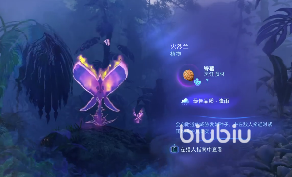 到达区域地面后进入到查看视角,先向四周进行查看,在有雾影菇的附近便会发现一个泛着光的标志物。我们靠近它后再进入到查看视角后,便会发现这株植物就是火烈兰。在这株植物上有一种叫做脊莓的可烹饪食材,在降雨的天气下能生成最佳的品质。我们需要取得五颗脊莓带回去,这里直接向叶子下方往各个角度轻轻拉动,便可摘下果实。