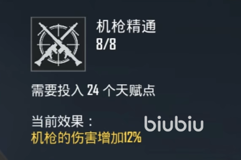 机枪精通:增加机枪伤害,最高达到12%,每级多1.5%。喜欢机枪的玩家还是很多的,尤其是满配之后最多能发射百发子弹,那种手感还是很爽的。