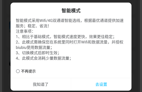 这款工具比较有特色的就是智能的加速模式,手机游玩可能信号不太好的时候就会切换网络。而biubiu加速器就可以检测玩家的游玩设备网络状态,从而自动切换更加稳定省流的最优通道。智能模式相较于传统的加速模式连接的速度会更快,而且效果也会更加稳定。我们在开启加速之后也可以通过简单的设置去启用智能模式,也是小编比较推荐大家去使用的。