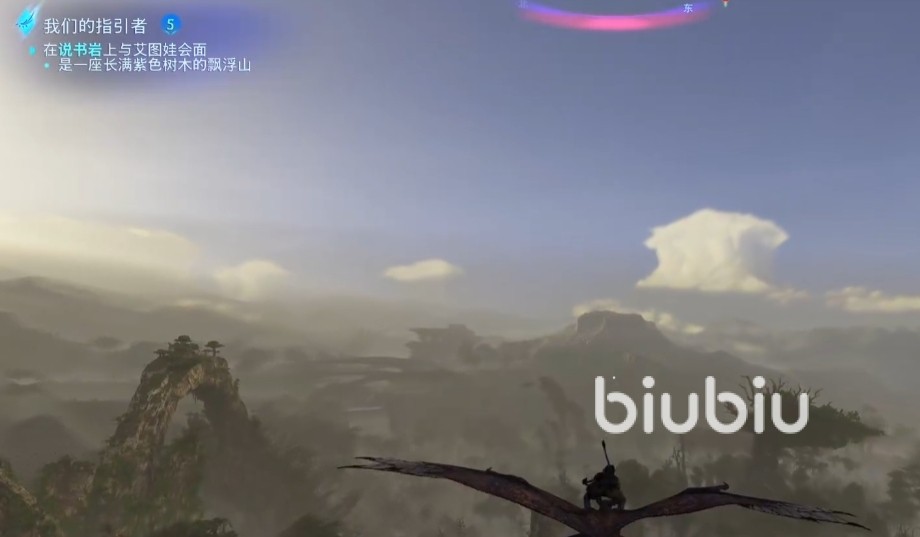 这个新任务一上来就需要玩家驾驶伊卡兰飞翔在天空中,因为人类活动对星球的污染,让飞行显得有些困难。根据提示主角需要前往说书岩,这是一个长满了紫色树木的漂浮山,很好辨认,到达后跟艾图娃会面就好了。