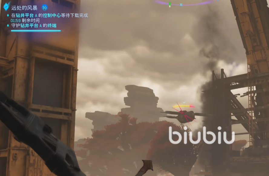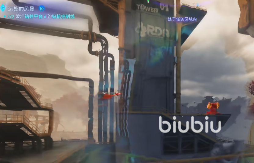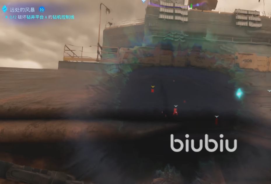 线路破坏之后还需要把保险丝也摧毁,然后攻击暴露的钻井核心,这样才算是完成了大半任务。但是光是如此还不够,控制中心那边还有任务要完成,位置在钻机的西北方,会有蓝绿色光柱进行提示,一路跑过去继续行动。