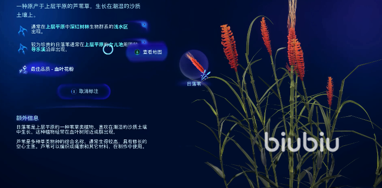 可以看到芦苇还是和地球上的一样在地面,这一带生长的主要为日落苇,和它的名字一样,如同夕阳一般的红色是它的特点。采集方面不需要像其余材料一样来回扭动鼠标或者手柄,随手一拿就能获得,品质的话得看运气,不过这地方出高品质材料的几率还算不错。