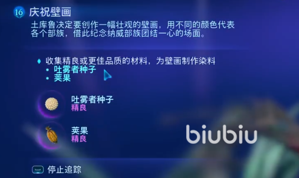 通过下图我们可以知道,土库鲁决定要创作一幅非常壮观的壁画来纪念纳威部落团结一心的场面,因此需要我们去寻找两种材料当做壁画的燃料,它们是品质精良以上的吐雾者种子和荚果。