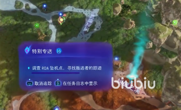特别专送这个任务的接取地点位于黑影森林的纠缠之溪,当我们飞到这个地区的时候便会自动接取到该任务。根据任务的提示我们需要调查RDA坠机点,并且寻找叛逃者的踪迹。这里可以从回旋轴坐上伊卡兰向东飞到纠缠之溪,到达任务区域内会发现有一处火光蔓延的地方。我们前往那里进行搜索,遇到小箱子可以打开,黄色的里面有一些备用部件可以获取到,而绿色的箱子我们则可以获得晕眩手雷。