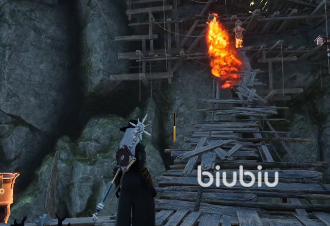 在上去的过程当中需要注意两个点,第一点是在这个路途当中需要注意陷阱,如果不是赶时间的话大家可以慢慢来,因为陷阱只会存在一小段时间。第二点就是要当心拦路的火焰,因为它在喷射一会以后只会停几秒钟,我们要做的就是在这个时间内跑过去就可以了。