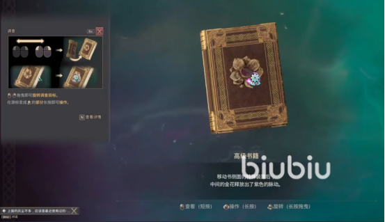 之所以挑选华丽的书这个任务,是因为很多玩家会在这里卡住,一直无法使用道具,怎么点击都没有反应,算是游戏初期第一个麻烦的地方。其实这里想要打开书籍还是很容易的,只要我们把鼠标移到书籍上,当光标发生变化之后,再按住左键不动,就可以打开它了。