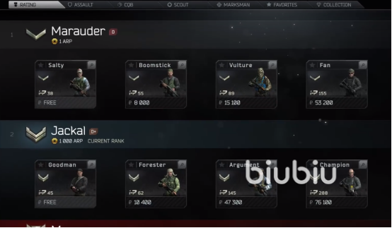 我们进入装备预设界面,在最上面可以看到有很多分类,从左导游分别是段位,突击,CQB近战,斥候,狙击,星标收藏和特殊。其中段位装备是根据玩家自己的排位分段来解锁的,而经验能解锁的是突击,CQB近战,斥候,狙击这四个。在一开始我们只能体验到每个系最上面的几套装备,如果想要体验下一层的装备,就需要先使用上一级的装备去打游戏,并打满经验才能解锁下一层的。