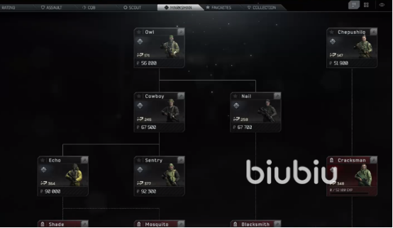 那么关于逃离塔科夫竞技场装备科技树就介绍到这里了,我们在解锁装备技能树之前,可以先看看最下面是什么武器,选中想要的装备后,再使用上面的武器进行战斗。比如想体验狙击枪系列,那么前面就需要使用Owl,然后使用Cowboy,再转Echo就可以了。