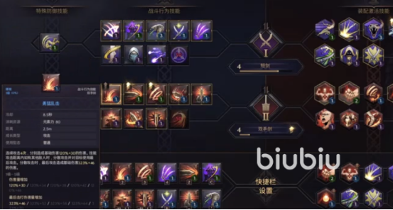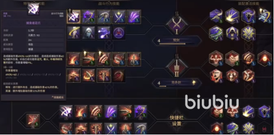 技能方面,常规带的是匕首的技能,前面5个技能是必带的,分别是捕食者足爪,暗影袭击,剧毒注入,残酷切割和投掷匕首。最后带一个终极技能死亡烙印,就是50级时所需要的技能组合了。大剑的技能我们常规带勇猛乱击,冲击破,一击必杀,达芬奇气魄和斩断大地以及破甲技战意粉碎。
