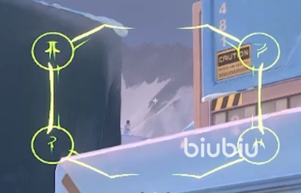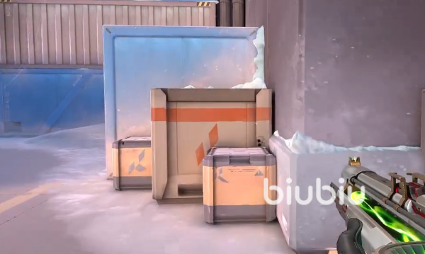 首先我们来到地图的A点中路区域,这个时候向右边看会发现一个正方形的木箱子。我们直接跳上木箱子,然后向前瞄准面前这块山没有雪的地方,再按下键盘上的Q键将烟丢出去。 这个烟开启以后就可以将整个中路阻隔掉,并且因为有这个烟的存在,我方的队友也可以混着烟钻到B点位。