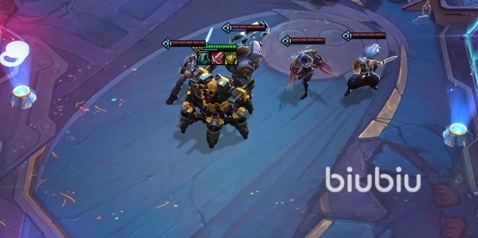 他的技能挺酷炫的,可以释放准备就绪的士兵,然后这些小兵会随机跳向一名敌人并且造成伤害,分别是90/150/750的魔法伤害,每次实施技能的时候都会有3名新增的准备就绪的士兵。当然士兵的攻击目标优先级是按照距离来的,所以角色站的位置就比较重要。
