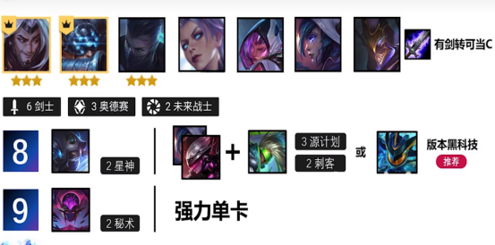 这套阵容强度和娱乐性兼具,剑圣两星吃分,三星吃鸡。阵容方面七人口成型,六剑,三奥德赛,两未来。八人口推荐补一张鱼人或者璐璐,凑两星神。这个版本的鱼人非常强势,是非常适合突进对方后排的卡牌。如果劫能拿到剑转,可以当C追三星。