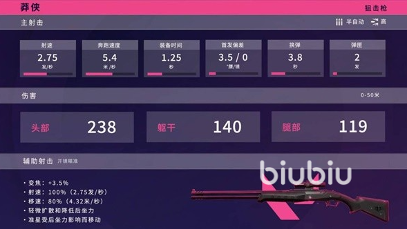 这款武器会比较适合那种战场决斗的角色,对头部的伤害是最高的达到了238,这样只要准度跟反应速度够好,能够最快时间瞄准敌人头部。2连发的不俗战力,再加上它的子弹穿透力也很强,很适合穿墙击杀,喜欢玩钱搏尔的一定要尝试下。