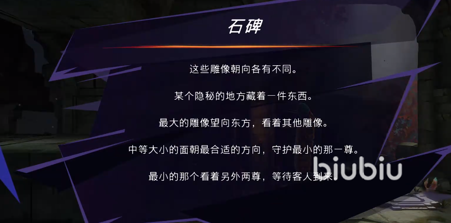 在这里我们可以看到三个底座,通过阅读石碑上的提示得知,需要玩家将雕像摆放在正确的方向才可以激活神秘宝箱。