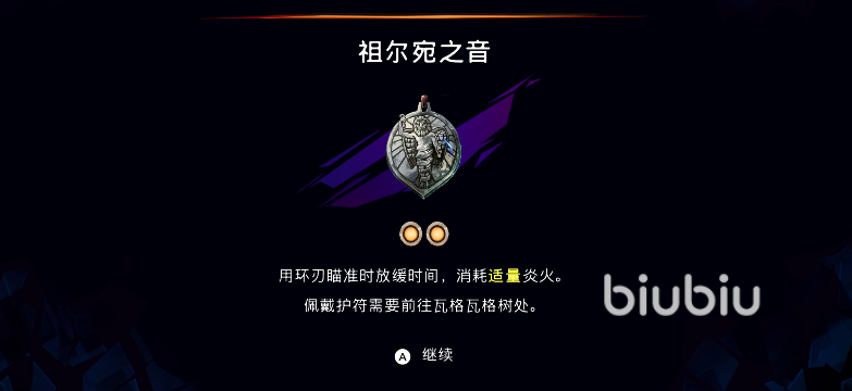 该护符可以在环刃瞄准时,时间流逝会进行放缓,这类似于传统ACT中的“子弹时间”,可以让你更安全的进行瞄准,不过你需要消耗一定量的炎火,并不是无消耗的道具,但依然会在战斗中有很大的帮助。