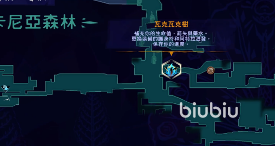 我们从货物空间快速移动点往右走,然后到瓦格瓦格树后往上走,没有平台的时候,可以踩在大水母身上。这个地图碎片最好是拿到了环刃西摩格之影再来。