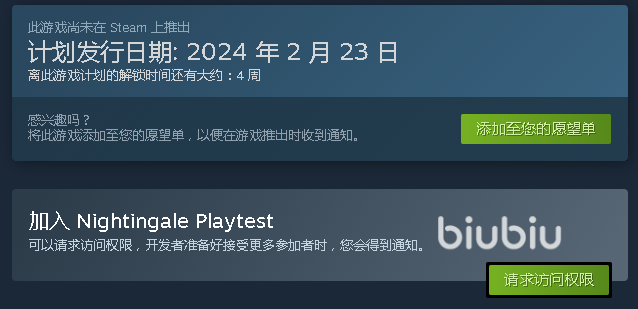 本作是一款开放世界生存冒险类游戏,允许好友间进行联机,目前定档时间在2024年2月23日,但你现在可以点击向开发者请求访问权限,以提前游玩测试版的内容,前提是开发商同意了你的请求。正式版目前还没有宣布收费方式,所以暂时还看不到游戏价格是多少。