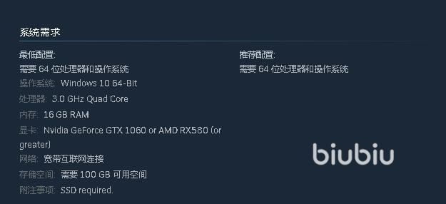 不过好在电脑配置方面也已经公布,需要64位以上的Windows10以上系统,以及性能为3.0GHZ以上的 处理器,显卡方面GTX1060以上型号就可以。一共需要100GB的硬盘空间以及16GB以上的运行内存,因为画面要求不高所以这个门槛,即便是五年前的主流设备也能达到,所以基本上不用担心自己的机子会带不动。