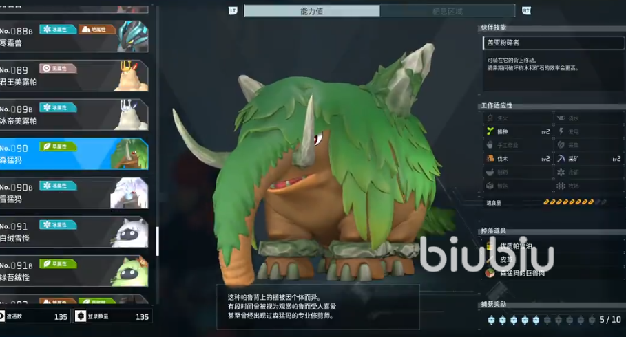 森猛犸的播种、伐木、采矿的适应性都是2级,非常适合前期玩家的资源获取。同时击杀它们还可以获取到大量的帕鲁油和皮革以及巨兽肉,可谓是用途广泛。
