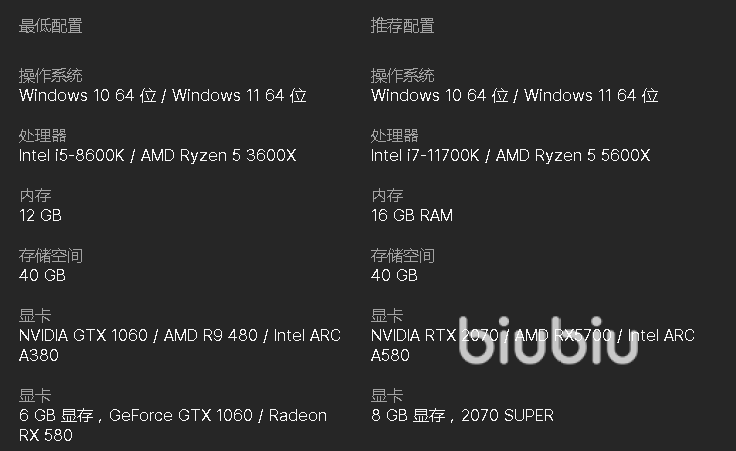最低需要Windows10以上系统才能进行游戏,低配处理器i5-8600K或者Ryzen5 3600X以上,运行内存方面需要12GB,而硬盘的话则需要40GB。对于显卡方面则需要GTX1060以上,而显存则是需要至少6GB,不过这仅仅只能最低画质游玩。如果你想高画质下玩的话处理器则需要至少11代i7以上,16GB内存也是必要的,在显卡方面则需要GTX2070以上,不过同性能的AMD显卡也是十分不错的。