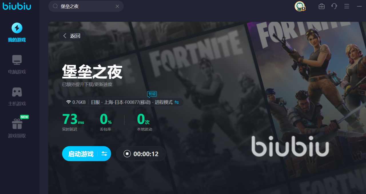 使用biubiu加速器加速游戏的方法很简单,只需在游戏库内搜索进入“堡垒之夜”加速专区,装好游戏,点击一键打开加速即可直接进游戏,无需额外的操作与复杂的调参数,流程极简主义。