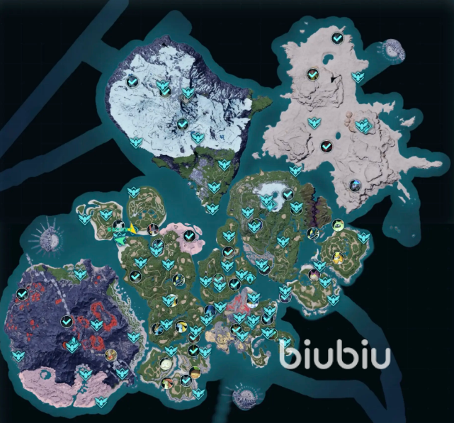 关于位置没法用语言来描述,所以你可以根据插图来更直观的看到他们的分布,羽翼标示就代表可传送的装置,而勾则是代表已完成的帕鲁挑战。这些传送点也并不是上来就给你解锁,你需要到达地图之后自己去发现它,直接上来就显示全了估计就没什么探索欲了。
