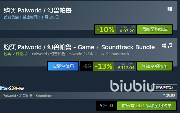 由于游戏是以抢先体验版的形式上线的,所提首发平台只有steam和xbox,而steam上总共分为了三个版本。标准版现在有9折的优惠,售价为97.2元,而豪华版仅仅多出了一个音乐包,游戏加上这个捆绑包的折扣为87折,售价是117.04元,不过还有一个额外的DLC扩展售价为26元,目前首发优惠截止日期到1月26日。