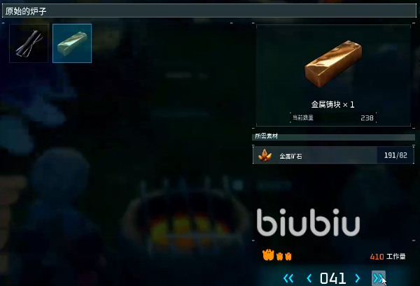 找到金矿的位置后,我们在附近建立第二个终端,这样方便我们在金矿数量采集满了后,可以直接通过终端运输回基地了。最后我们在基地里面,通过原始的炉子这个制作台使用82个金属矿石就能获得一个金属铸块了。