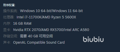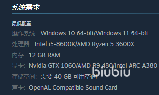 首先对于操作系统需要满足64位的WIN10/WIN11,CPU的话则得是英特尔八代的i5或者同等算力的AMD,显卡方面N卡得用上GTX1060或者性能差不多的A卡,同时硬盘空间最少得备上40G的储存空间和12G的内存,以上配置均满足以后就能以最低特效运行游戏了。