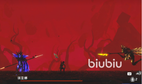 当两个技能循环释放了几次之后,琪亚娜会释放他的大招,坐骑飞上空中,背景变成红色。人物会受到从左,上,右三个方向源源不断的冲刺攻击,我们可以通过下蹲,跳跃,滑铲来分别躲避不同方向的敌人。等到技能释放完毕后,BOSS也就进入到了第二阶段。