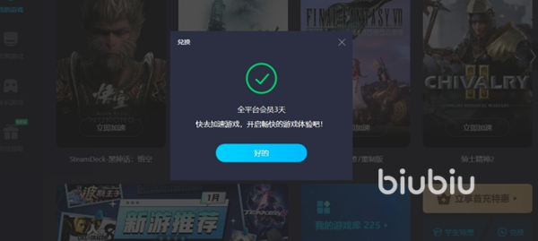 有的小伙伴会问,这款加速器是不是只有开通会员才可以使用,有什么尝试的机会呢?除了新用户注册可以获取的24小时时长之外,我们在软件中点击兑换,然后输入“biubiu不卡顿”(注意字母要小写输入)还可以获取3天免费试用加速时长,足够大家对已拥有的游戏作品进行测试了,而且开启加速之后还可以为游戏下载更新提速,还是非常不错的哦!