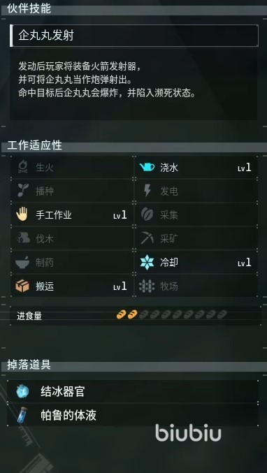 一般在水系的帕鲁身上都会掉这种材料,玩家可以直接去海边尝试击杀它们,不过最常见的还是企丸丸,你几乎在很多水域的岸边都能见到它们。此外他还能掉落结冰器官,可以说是一个双属性特殊材料皆有的帕鲁。