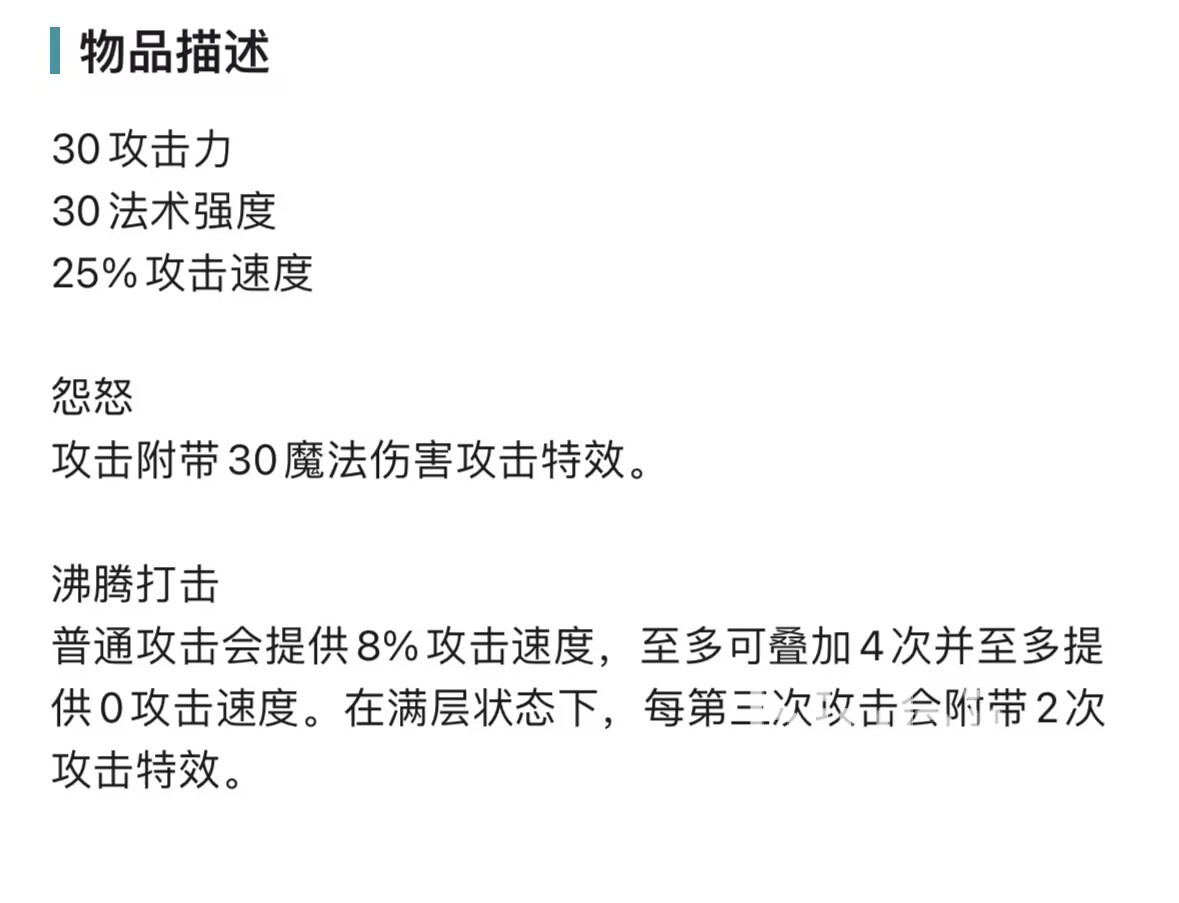 在新赛季中移除了羊刀的暴击转化率,虽然它本身并不自带暴击率,但这就意味着能够和无尽这种增加暴击的装备同时使用。基础效果的30攻击力法强,25%攻速以及攻击附带30法伤特效,再结合平A四次后,沸腾打击会在后续每三次攻击后触发两次特效伤害的属性,让这个赛季ad暴击装迎来了一波新的加强。