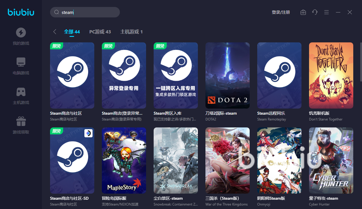 接下来就可以进行steam账号的创建,操作之前记得打开biubiu加速器,搜索steam并开启加速稳定网络连接。