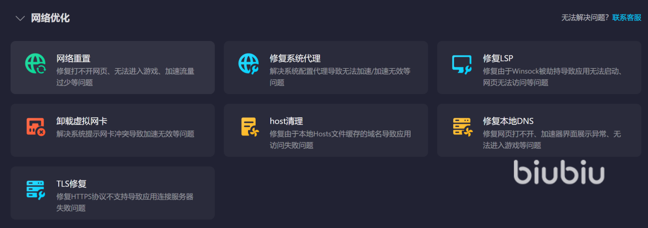 有了这一biubiu加速器的加速,玩家就可以优化游戏的网络环境、降低延迟率,并防止游戏卡顿、闪退等问题,给小伙伴们带来更加优质的游戏感受。除此之外,biubiu加速器具备着许多其它的实用功能,该软件覆盖了多个区服,包含着国服专区,对于玩家的多种需求均可满足,也支持许多PC端游戏进行加速。