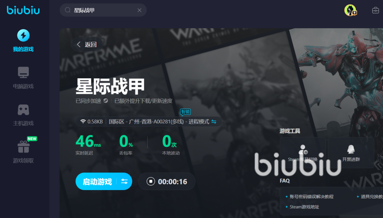 星际战甲是Biubiu可以加速的游戏之一,在加速星际战甲的网络的时候,如果自己电脑上有这款游戏的话,在biubiu可以自动检测出游戏,用户点击加速按钮就可以开启网络加速,网络加速开启之后玩家就可以享受专属的游戏网络,让玩家的星际战甲体验更好。
