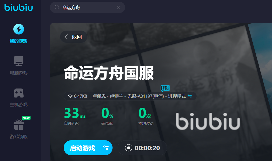 命运方舟是biubiu加速器可以加速的游戏之一,玩家在对命运方舟的网络加速时候,如果用户自己电脑上有这款游戏的话,在biubiu的:“我的游戏”板块可以自动检测出游戏,玩家点击加速按钮就可以进行游戏网络加速,开启网络加速之后就可以享受专属的游戏网络,让玩家的游戏体验更好。