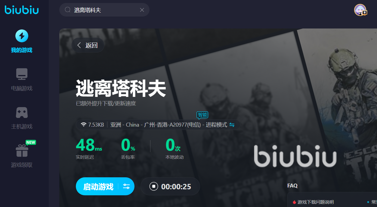 随着不断的更新,在逃离塔科夫这款游戏中,除了经典的玩法之外,最近还上线了许多新颖的战斗模式。而且在这款游戏中,大家可以体验到更加真实,更加硬朗的战斗场景,当然大家不仅要有足够好的硬件设备,还要有稳定的网络才可以运行这款游戏。为了让大家能够在下载这款游戏以及运行游戏的时候拥有更优良的网络,大家可以使用Biubiu对网络进行加速。