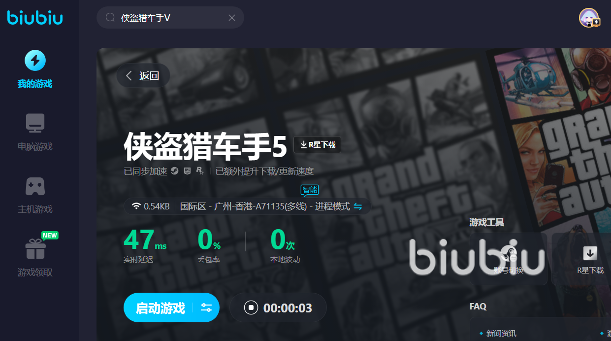 侠盗猎车手这款游戏在全球范围内拥有众多的忠实粉丝。甚至还有许多地区拥有专门的电竞比赛。在游戏中包括建筑,人物以及各种交通工具都是非常逼真。而且在游戏中还会适时的给大家播放一些非常出色的音乐。当然为了能够更好的体验到这些逼真的游戏体验,大家可以在游戏运行时使用biubiu对网络进行优化加速,保证网络的稳定性。