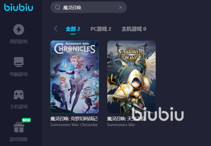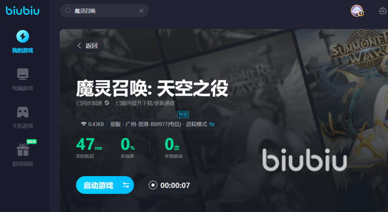 魔灵召唤是biubiu加速器可以加速的游戏之一,玩家在加速魔灵召唤的时候,如果自己电脑上有这款游戏的话,在biubiu的:“我的游戏”板块可以自动检测出游戏,点击就可以进行游戏加速。