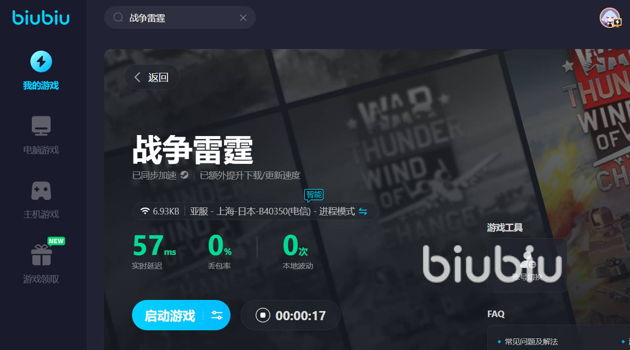 战争雷霆是biubiu可以加速的游戏之一,玩家在加速战争雷霆的时候,如果自己电脑上有这款游戏的话,在biubiu的:“我的游戏”板块可以自动检测出游戏,点击就可以进行游戏加速,开启网络加速之后就可以享受专属的游戏网络,让玩家的游戏体验更好。