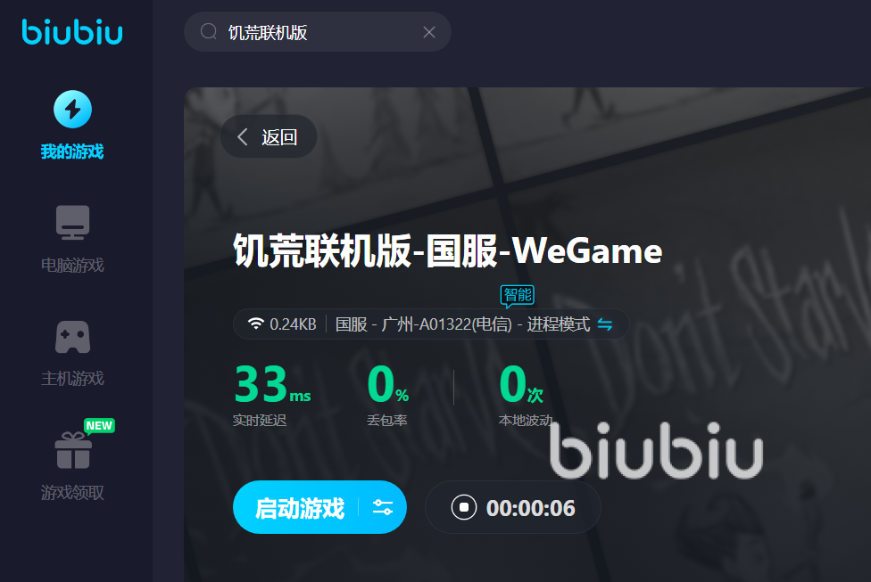 饥荒联机版是biubiu加速器可以加速的游戏之一,玩家在加速饥荒联机版的时候,如果自己电脑上有这款游戏的话,在biubiu的:“我的游戏”板块可以自动检测出游戏,点击就可以进行游戏加速,开启网络加速之后局可以享受专属的游戏网络,让玩家的游戏体验更好。