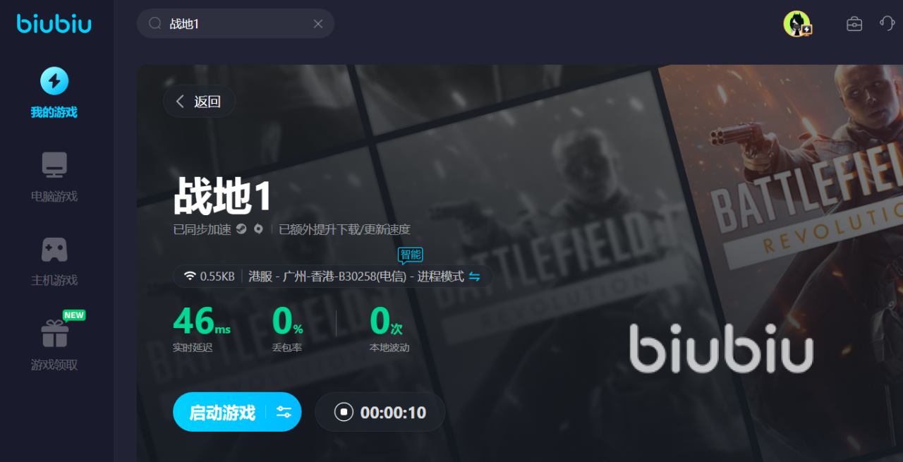 战地1是Biubiu可以加速的游戏之一,玩家在加速战地1的时候,如果自己电脑上有这款游戏的话,在biubiu的:“我的游戏”板块可以自动检测出游戏,点击就可以进行游戏加速,开启网络加速之后就可以享受专属的网络加速了,让玩家有更好的游戏体验。