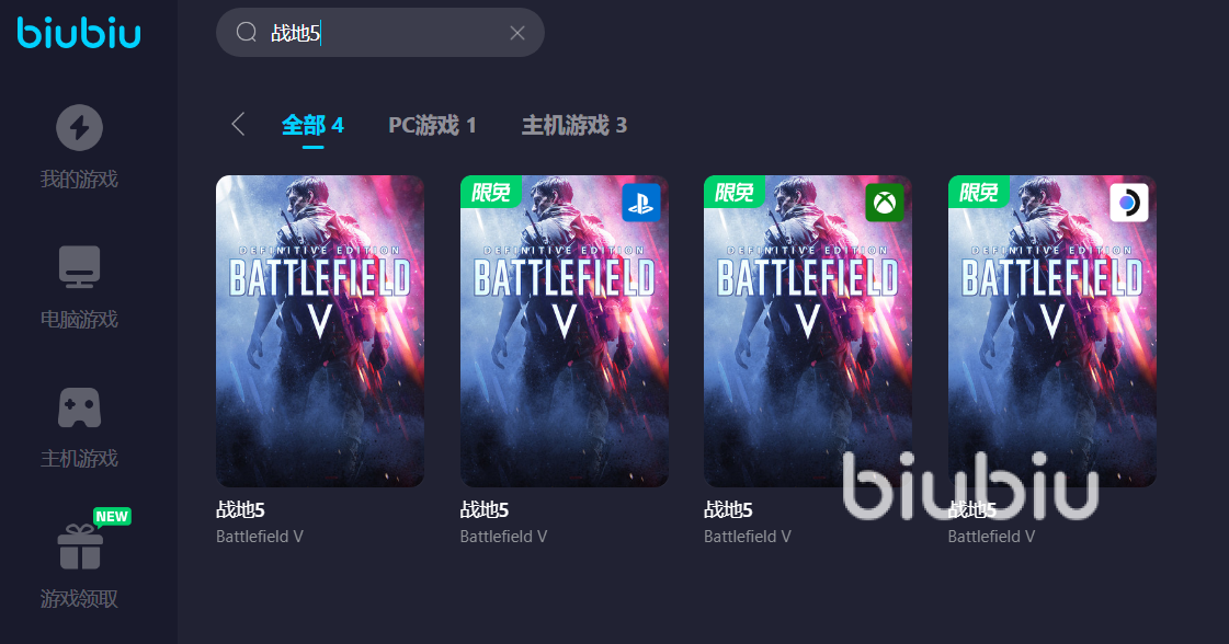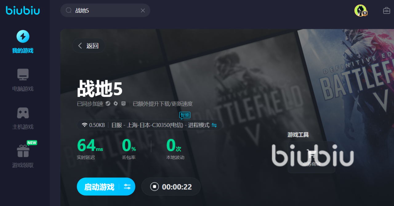战地5是biubiu加速器可以加速的游戏之一,玩家在加速战地5的时候,如果自己电脑上有这款游戏的话,在biubiu的:“我的游戏”板块可以自动检测出游戏,点击就可以进行游戏加速,开启网络加速之后局可以享受专属的游戏网络,让玩家的游戏体验更好。