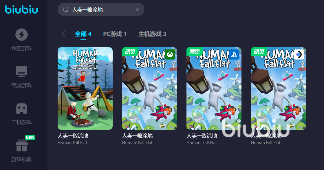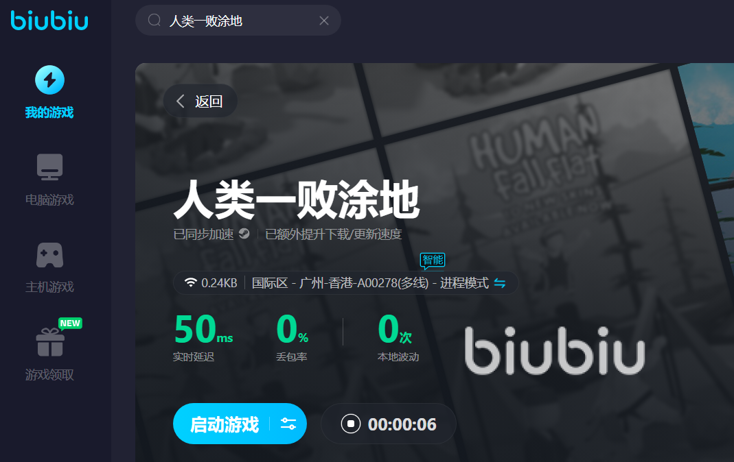 人类一败涂地是可以在steam平台购买下载,当然也可以直接在steam上打开游戏运行,在游戏运行打开之前,可以先用Biubiu加速器加速网络。因为已经安装了一败涂地这款游戏,在Biubiu上就可以检测出来,并且在主页面提供加速按钮,大家一键点击就可以开启网络加速。