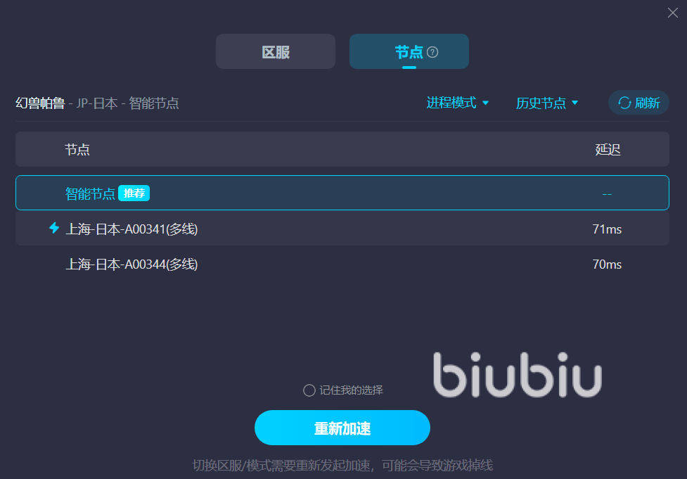 其次,部分玩家可能因为没有用过加速器玩日服的游戏,而担心不会选区加速。事实上,biubiu加速器使用方法较为简单,只需搜索相对应的游戏,在启动之前,加速器会提醒你选择区服日服,确认好区服,再按启动游戏即可一键打开加速。而进入加速之后,也可以在进程模式自由切换其他区,或者手动选择加速的节点线路,总的来说还是比较好上手的。